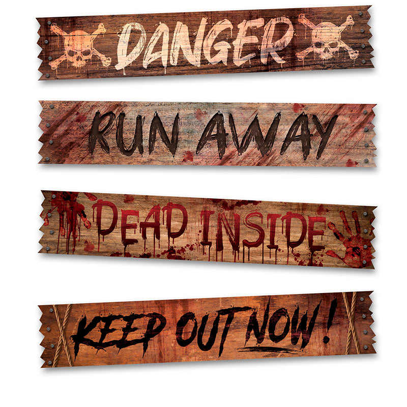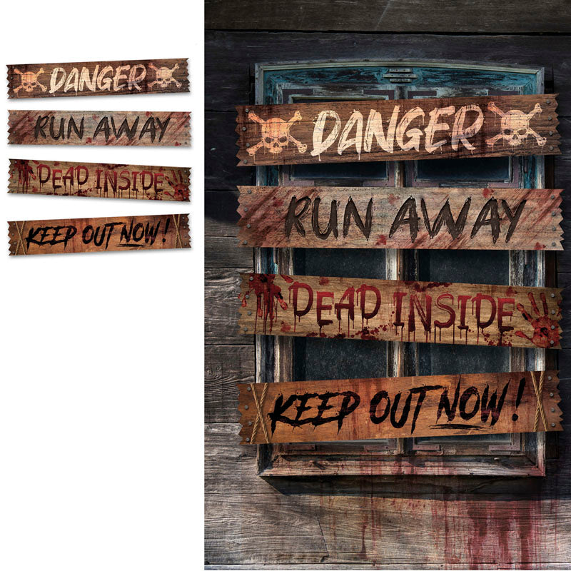 Cada cartel está diseñado con efecto madera envejecida y mensajes escalofriantes: DANGER, RUN AWAY, DEAD INSIDE y KEEP OUT NOW!. Salpicaduras de sangre, calaveras y huellas completan un aspecto realista y terrorífico, ideal para ambientar escenas de zombies, casas encantadas o laboratorios prohibidos.