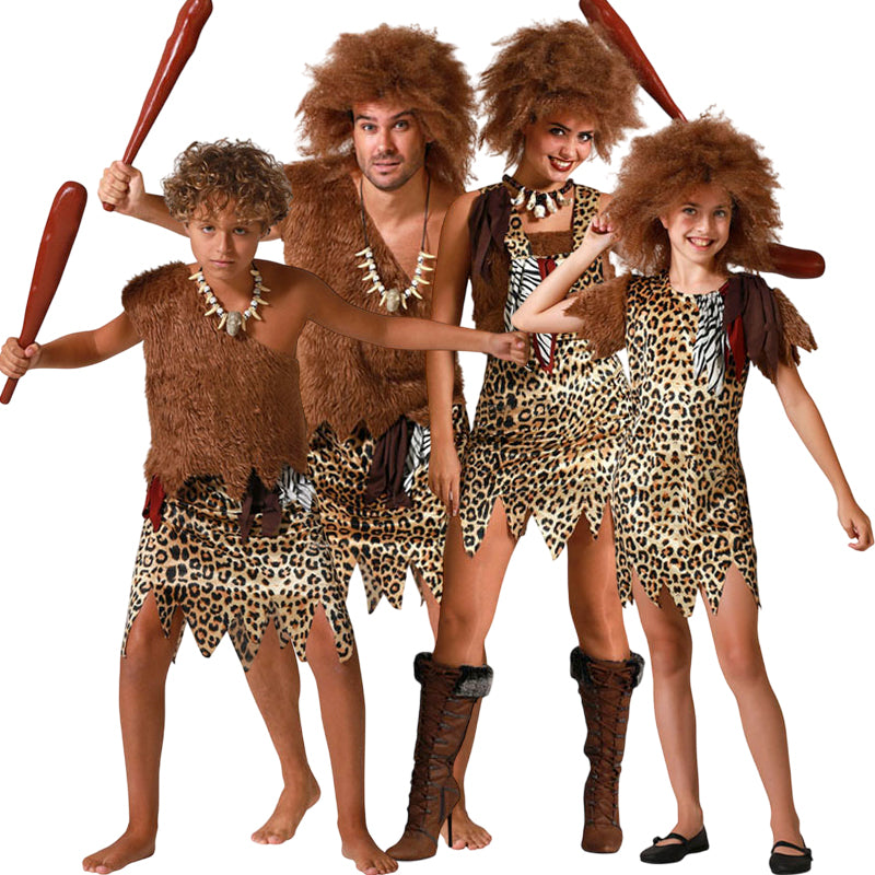 Fantástica idea para disfrazar a toda la familia de Cavernícolas Edad de Piedra con diseños a juego para hombre, mujer, niño y niña.