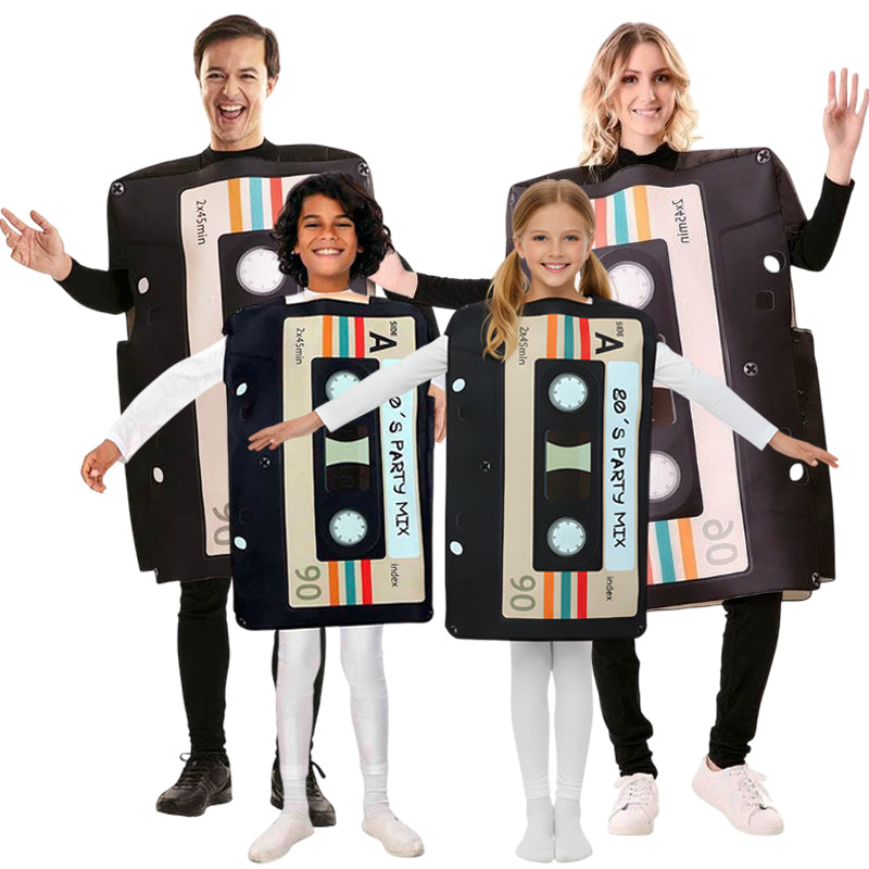 Fantástica idea para disfrazar a toda la familia de Cintas de Cassette Años 80 con diseños a juego para hombre, mujer, niño y niña. Puedes acceder al contenido de cada disfraz más abajo en el apartado de “Completa tu look”, donde figura cada disfraz que pertenece a este grupo de forma individual.