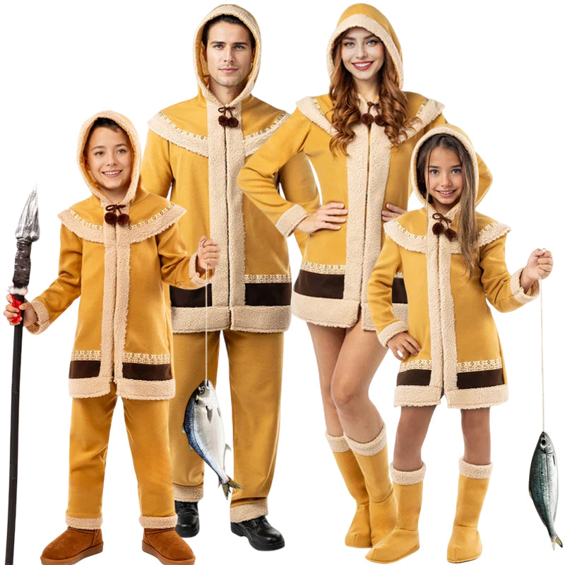 Fantástica idea para disfrazar a toda la familia de Esquimales Polo Norte con diseños a juego para hombre, mujer, niño y niña. Puedes acceder al contenido de cada disfraz más abajo en el apartado de “Completa tu look”, donde figura cada disfraz que pertenece a este grupo de forma individual.