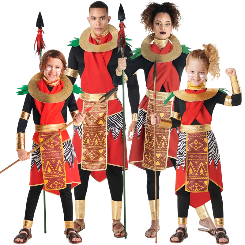Fantástica idea para disfrazar a toda la familia de Masáis Tanzania con diseños a juego para hombre, mujer, niño y niña. Puedes acceder al contenido de cada disfraz más abajo en el apartado de “Completa tu look”, donde figura cada disfraz que pertenece a este grupo de forma individual.