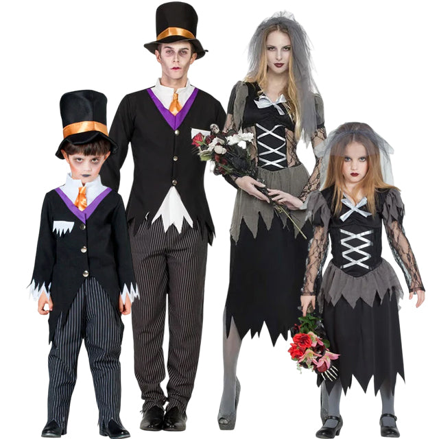 Fantástica idea para disfrazar a toda la familia de Novios Cadáver con diseños a juego para hombre, mujer, niño y niña. Puedes acceder al contenido de cada disfraz más abajo en el apartado de “Completa tu look”, donde figura cada disfraz que pertenece a este grupo de forma individual.