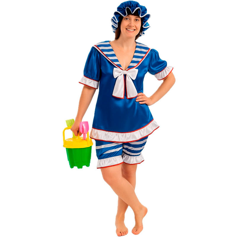 Este original disfraz de Bañista vintage de los años 20 en versión femenina es perfecto para convertirte de forma rápida de cara a tu próxima fiesta de disfraces temática en un personaje tan peculiar como esta bañista con su traje de baño o bañador de época. Incluido en este disfraz de señora de bañista antigua la camisa, el pantalón y el gorro. Los disfraces para señora más auténticos y económicos del mercado ideales para todo tipo de fiestas y desfiles de Carnaval. Puedes completar este disfraz e ir a juego con tu pareja gracias a la versión Disfraz de Bañista de los años 20 hombre.