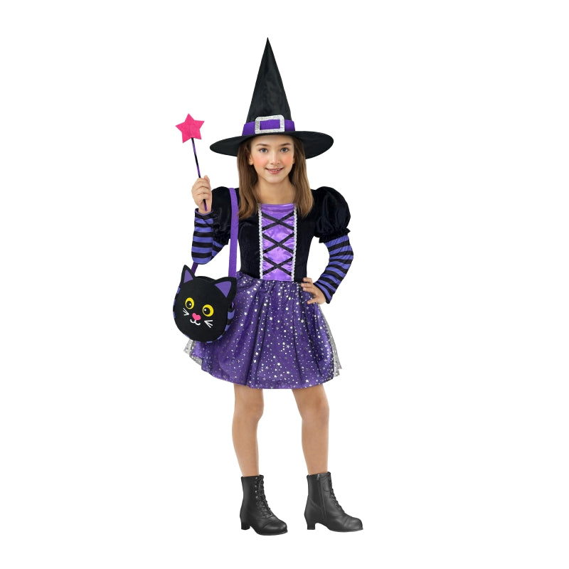 Disfraz de Bruja con accesorios para niña con vestido, sombrero, bolso y varita. Disponible en 4 tallas. Divertido y completo para fiestas mágicas o Halloween.