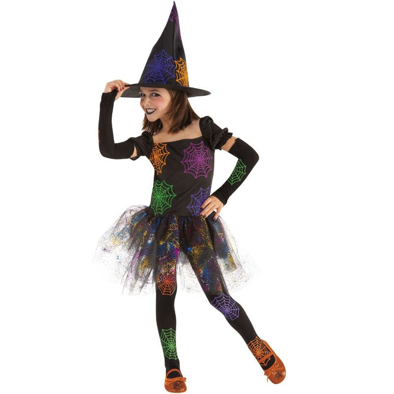 El disfraz Halloween de Bruja Telaraña para niñas incluye: vestido con tutú, manguitos, sombrero y medias | Este traje terrorífico de niña imitando a una Bruja con telas de araña multicolor está disponible en 3 tallas distintas