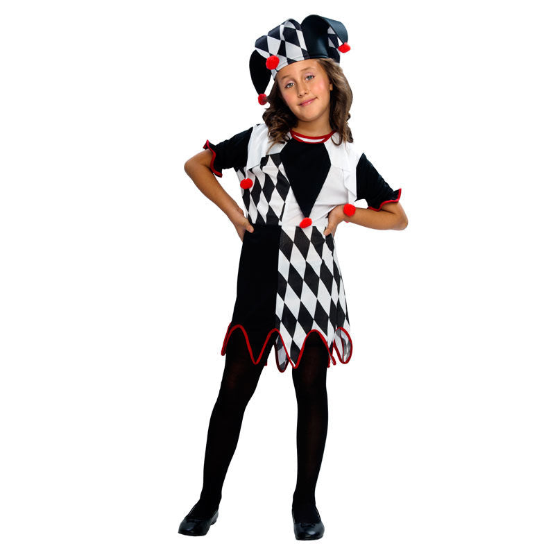 El disfraz de Bufona o Arlequina para niña incluye: Gorro y vestido.
