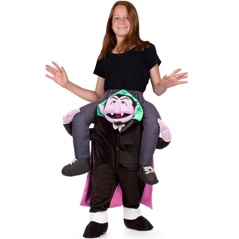 Este original disfraz a hombros de Conde Draco en Barrio Sésamo para niños y niñas incluye: pantalón con forma del personaje y piernas colgando | El disfraz ride on niño de Condo Draco está disponible en talla única