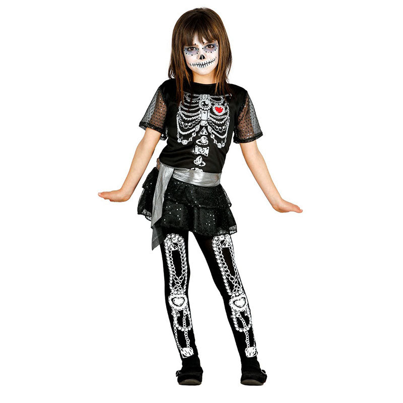 El disfraz de Halloween para niña de Esqueleta con acabados de lujo incluye: Vestido y medias.