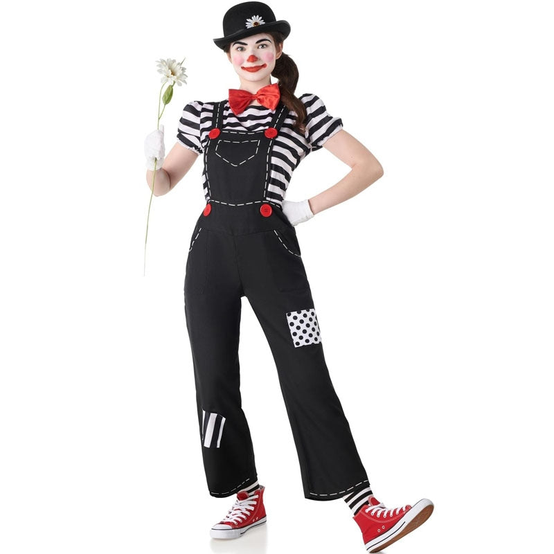 El disfraz original de Mimo a rayas para mujeres contiene: Camisa, Pantalón con tirantes, Lazo, Gorro, Guantes y Calcetines | Este traje de mujer para transformarte en Payasa mímica está disponible en 4 tallas distintas