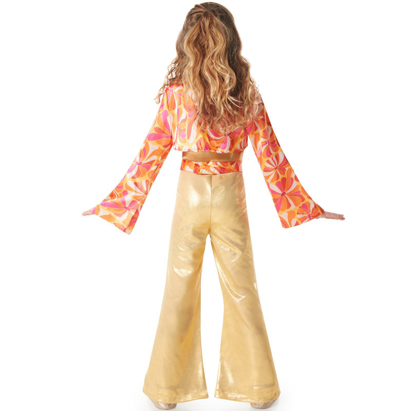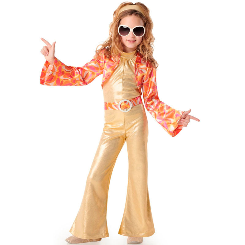 El disfraz original de Disco dorado años 70 para niñas incluye: diadema, chaqueta, mono y cinturón | Este traje de niña imitando a Look disco dorado retro está disponible en 4 tallas diferentes