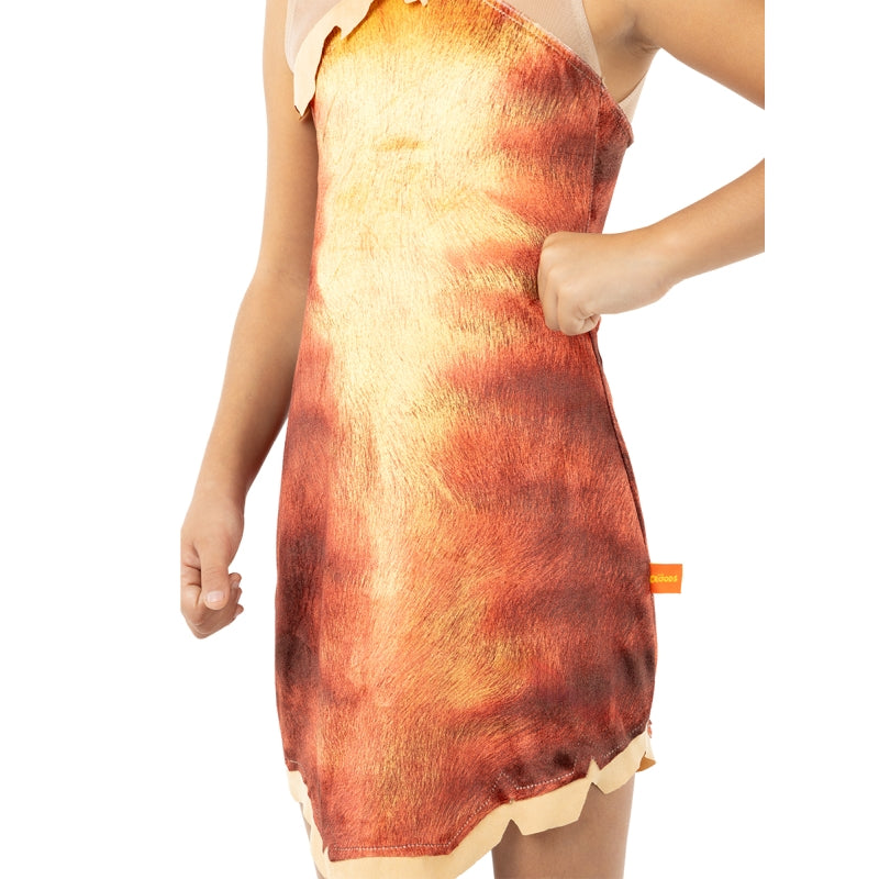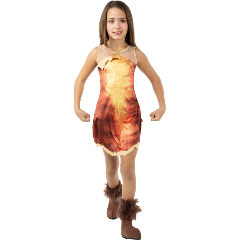 Disfraz oficial de Eep de Los Croods para niña con vestido y cubrebotas. Disponible en 4 tallas. No incluye peluca. Ideal para aventuras prehistóricas.