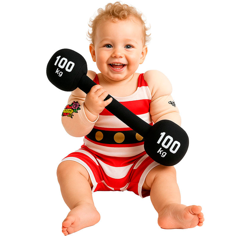 El disfraz original de Forzudo Circo a rayas para bebés incluye: mono y pesas | Este traje de bebé imitando a un forzudo adorable está disponible en talla única