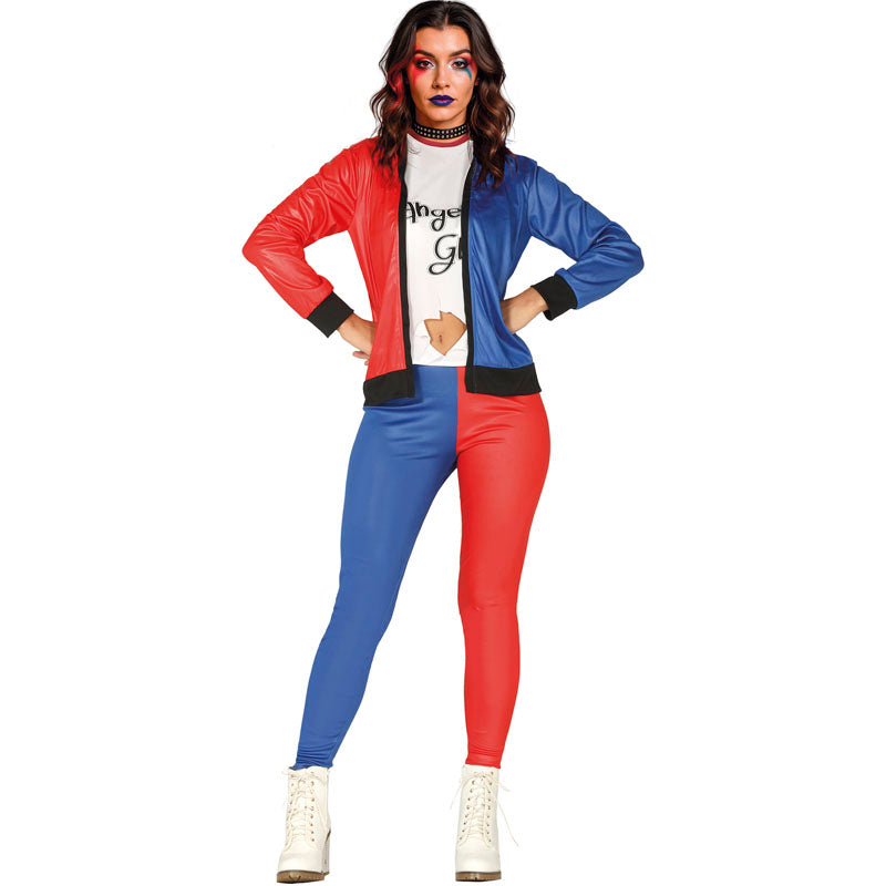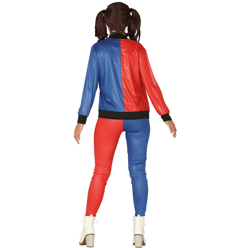 El disfraz Halloween adulto imitando a la super villana Arlequín para mujeres incluye: chaqueta con camiseta y pantalón | Este disfraz Arlequín mujer supervillana está disponbile en 2 tallas.