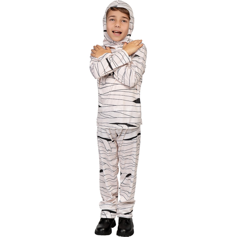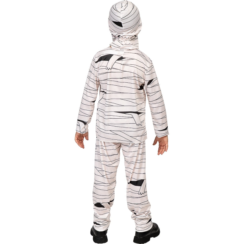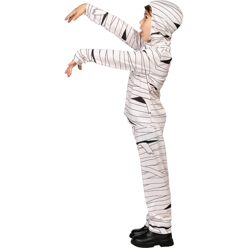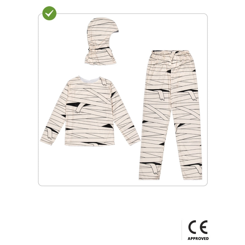 El disfraz aterrador de Momia Clásica para niños y niñas incluye: Camiseta, pantalón y pasamontañas | Este exclusivo traje infantil de miedo imitando a Momia clásica vendada está disponible en 4 tallas distintas
