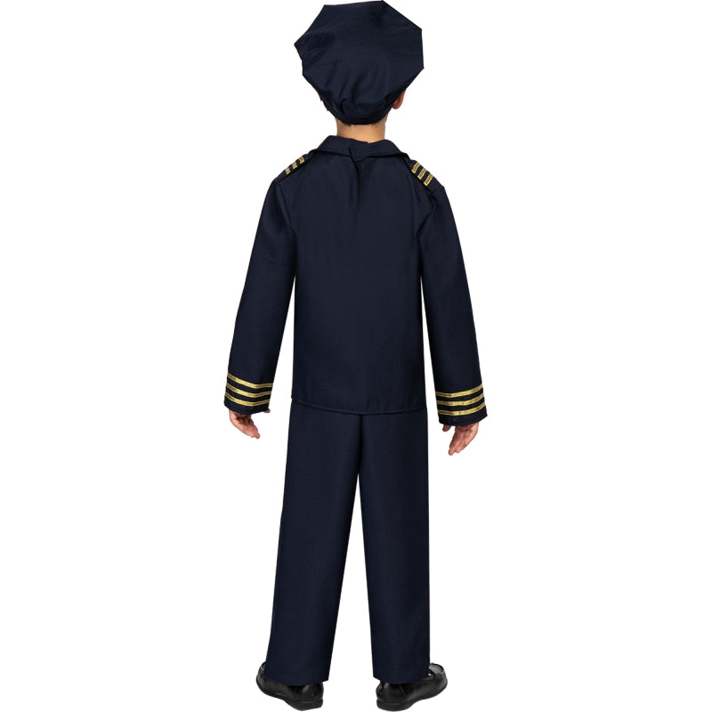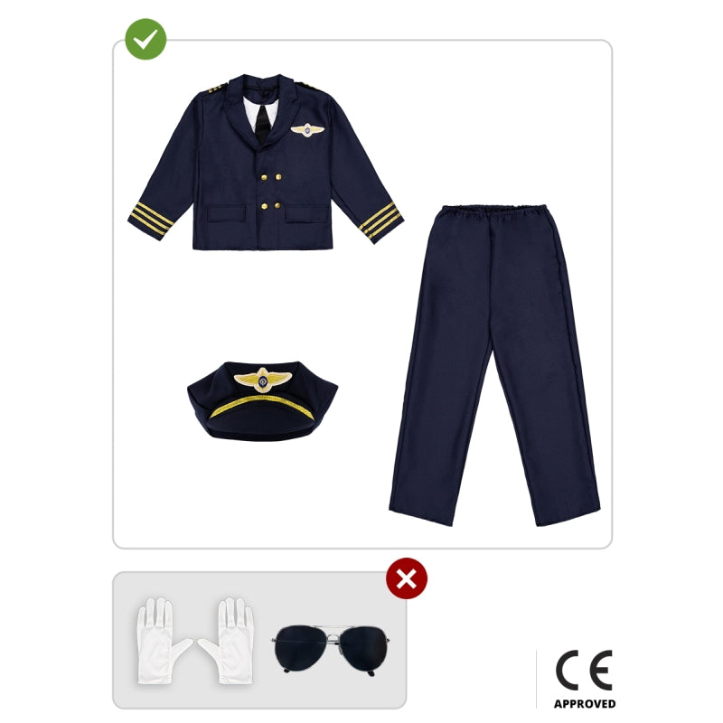 El disfraz exclusivo de Piloto de Aviones para niños incluye: Chaqueta con pechera, corbata, pantalón y gorra | Este traje de niño imitando al Piloto aviador de combate está disponible en 3 tallas distintas