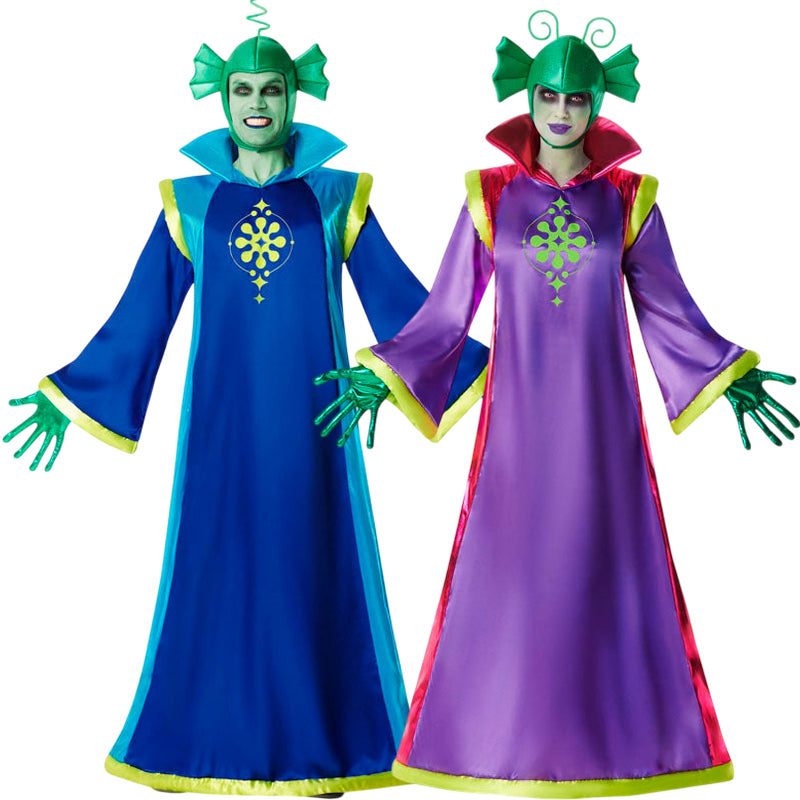 El disfraz de Extraterrestre azul para hombres incluye: capucha, túnica y guantes, mientras que el disfraz de Extraterrestre morado para mujeres contiene: capucha, túnica y guantes.