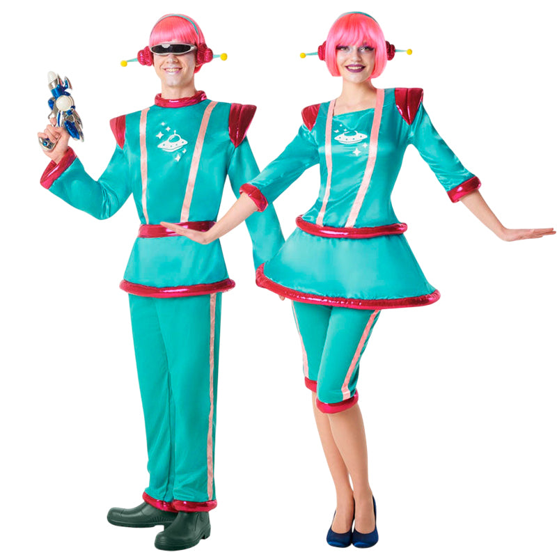 El disfraz de Marciano verde turquesa para hombres incluye: diadema, camisa, pantalón y cinturón, mientras que el disfraz de Marciana verde turquesa para mujeres contiene: diadema, vestido y pantalón.