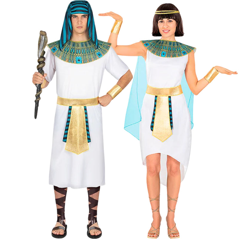 El disfraz de Faraón para hombres incluye: Túnica, cinturón, muñequeras y pieza para la cabeza, mientras que el disfraz de Reina Egipcia Naunet para mujeres contiene: vestido, cuello, cinturón y corona.