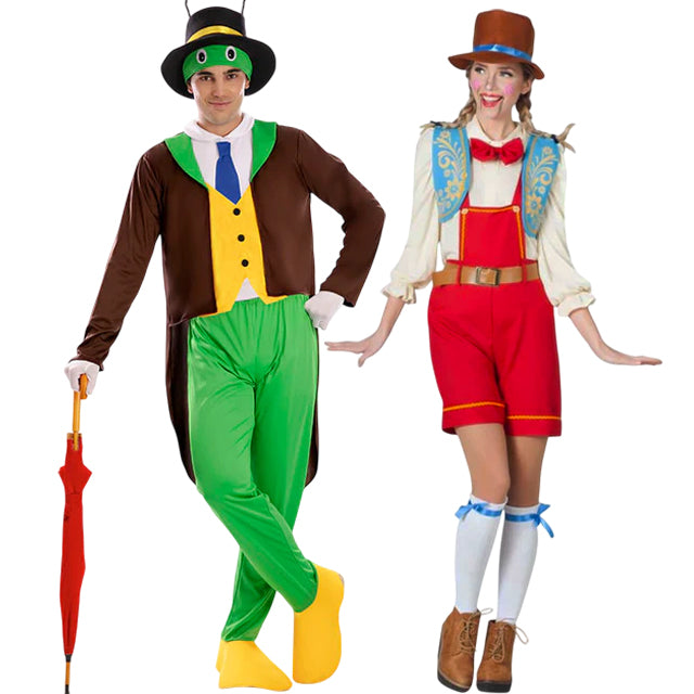 El disfraz de Grillo del cuento de Pinocho para hombres incluye: Pantalón, chaqueta con camisa simulada y sombrero, mientras que el disfraz de adulto para transformarse en la marioneta Pinocho de mujeres incluye: Sombrero, chaleco, camisa con pajarita, mono, cinturón y cintas para piernas.